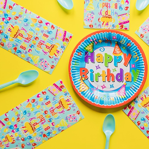 Konsepte uyum sağlayan desenli ve renkli doğum günü peçeteleri.